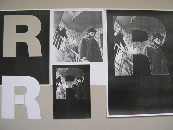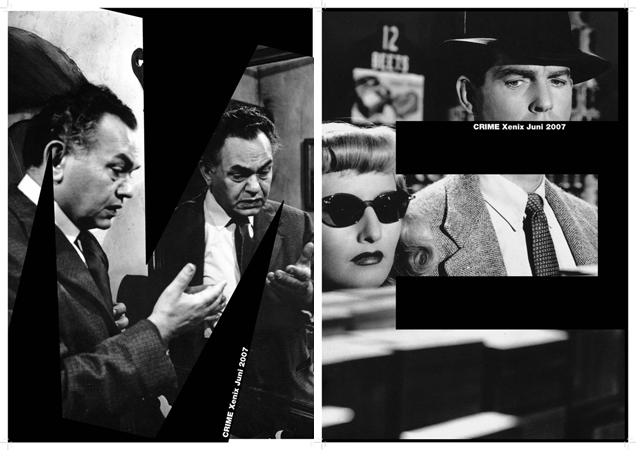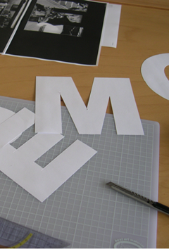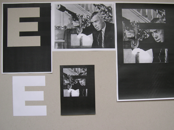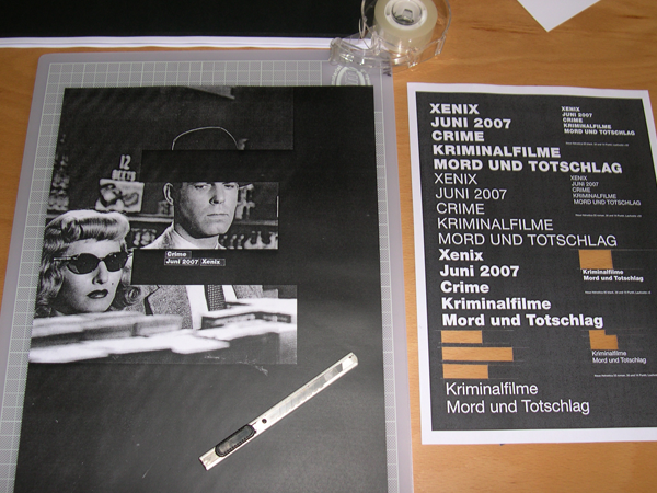 Gestaltung eines Filmplakatas anhand vorgegebener Bilder aus dem Film noir und Texten im Schriftschnitt Helvetica. Analog begonnen mit Schere, Papier, Cutter und Unterlage.