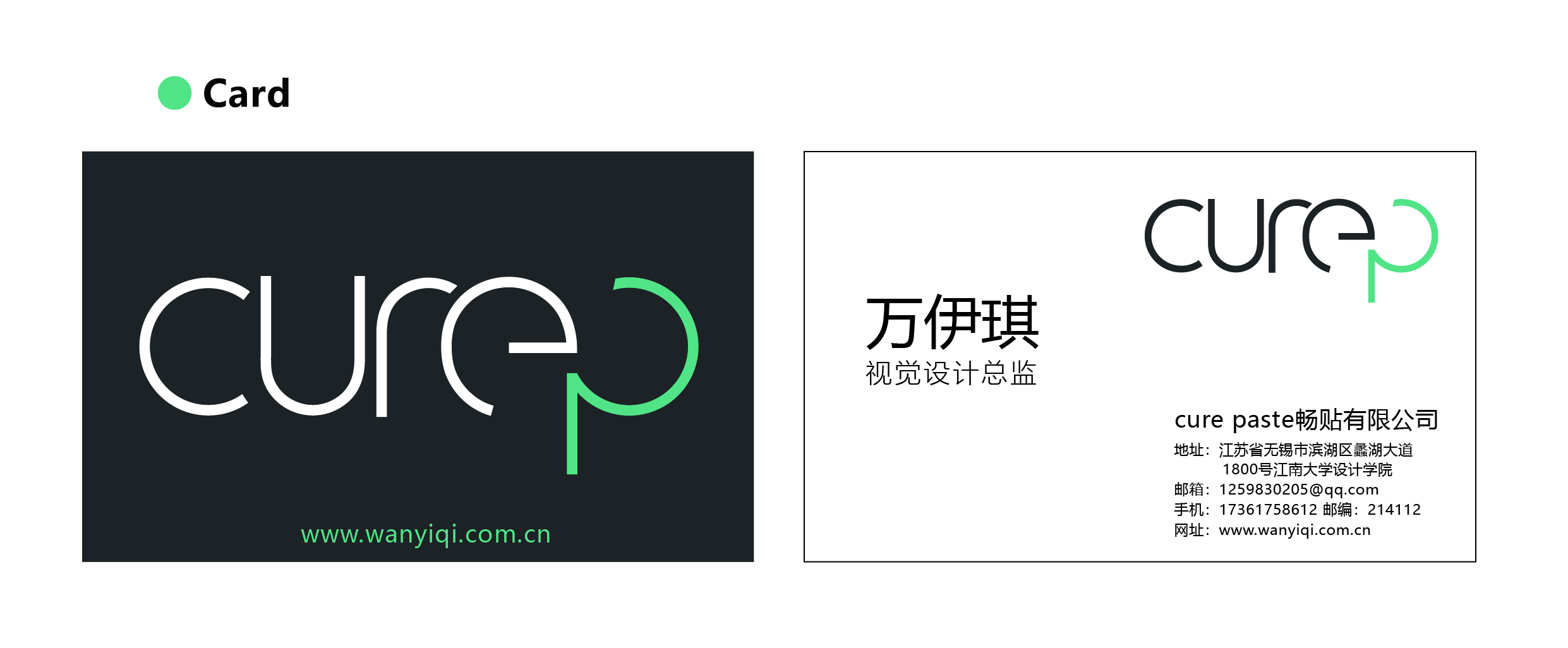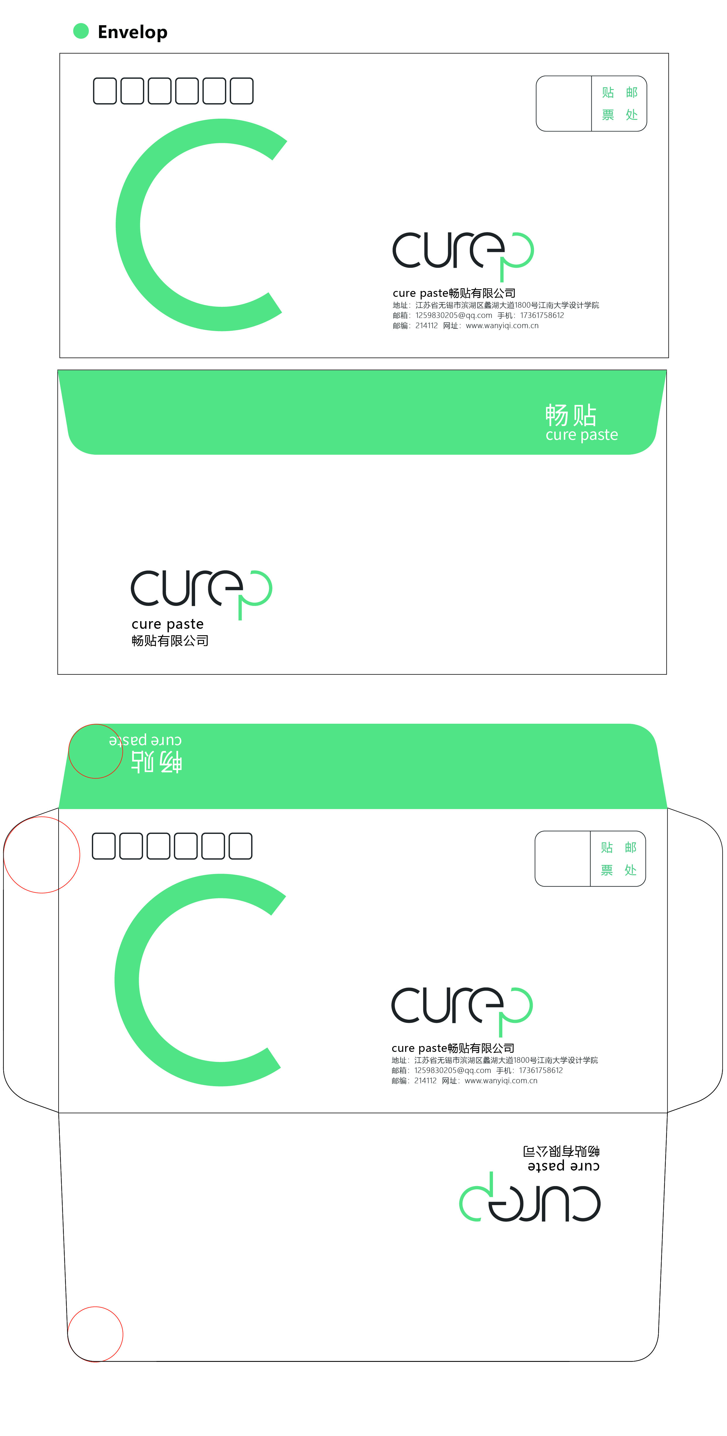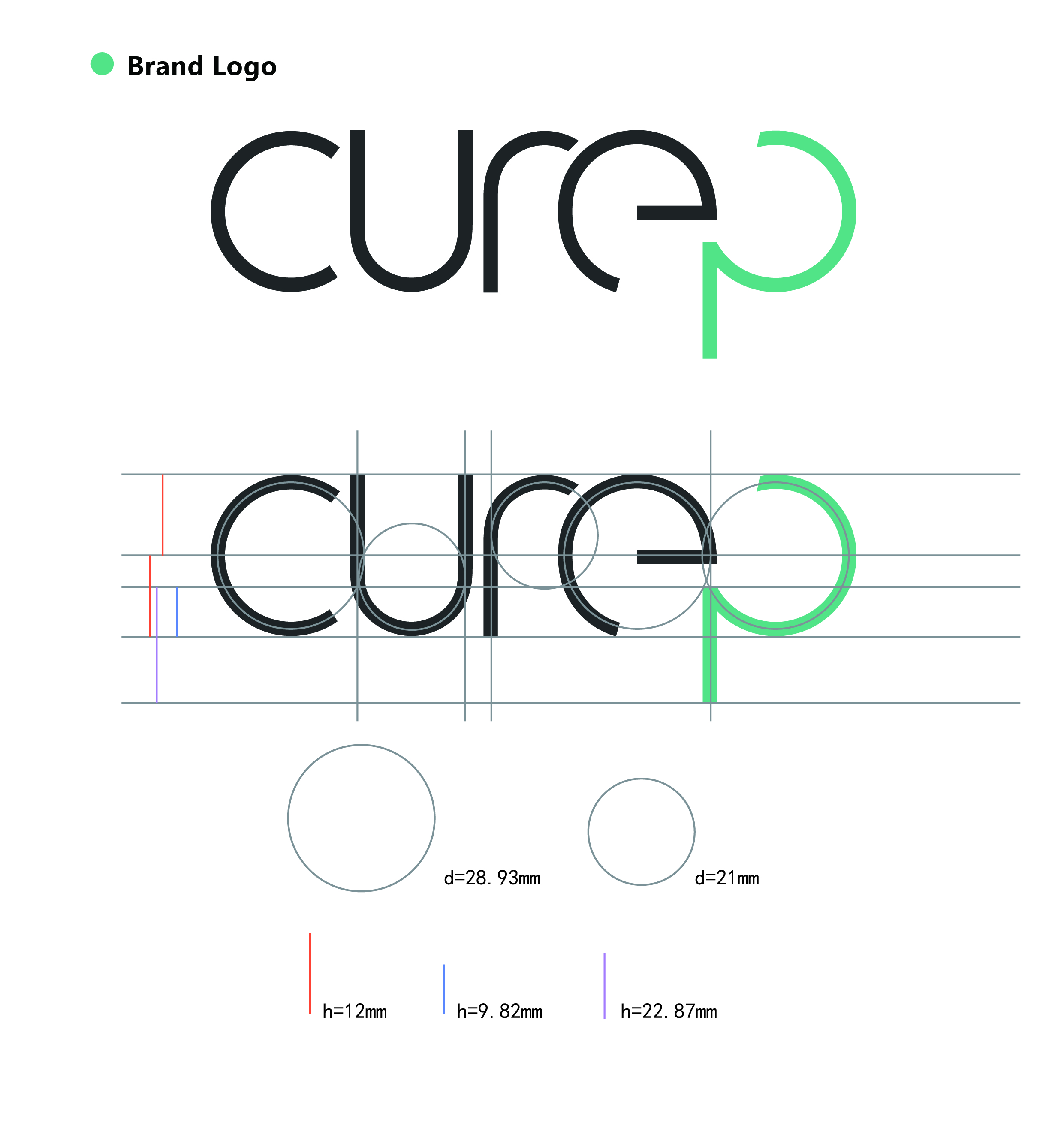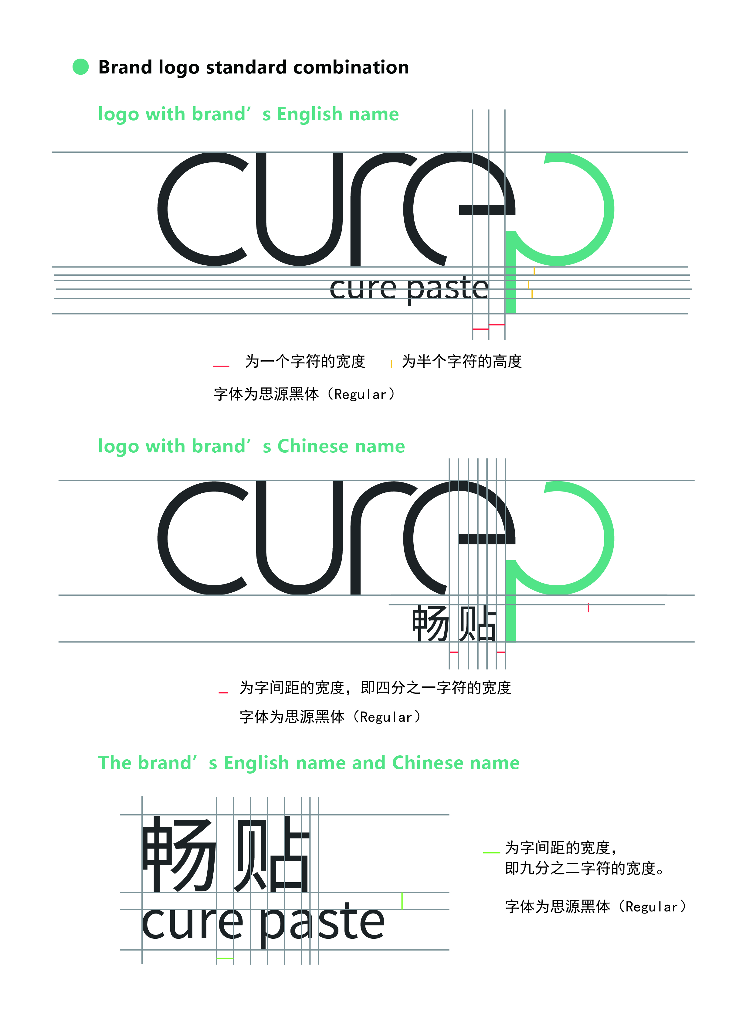 “Cure P” can be called “Cure Paste” and the main product of this system is a medical round massage paste. Therefore, all the letters in the logo are evolved from circles. The main color is green. Because green is the color which is often used in medical settings, it conforms to the concept of health and medical care. Auxiliary color